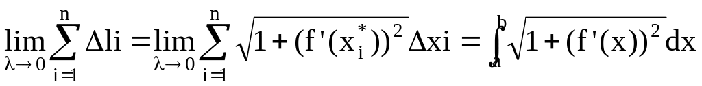 Теорема. Якщо функція y=f(x), визначена на відрізку [a,b] , неперервна на ньому разом зі своєю похідною f’(x), то довжина L відповідної дуги існує і