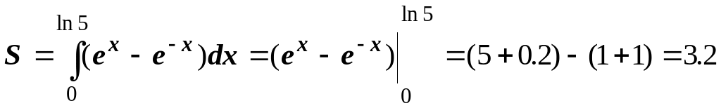 2. Обчислити площу S фігури, обмеженої лініями y=ex,y=e-x та x=ln5