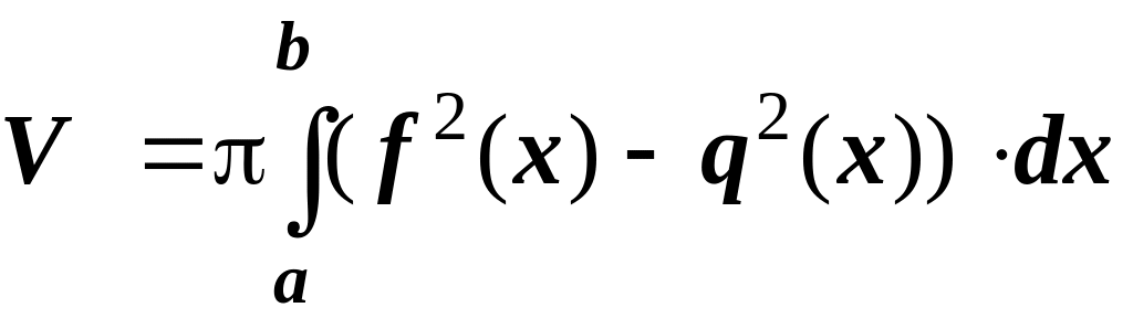 Формула (6.14) узагальнюється на випадок тіла, утвореного обертанням навколо осі Ох криволінійної трапеції, обмеженої лініями y=f(x); y=q(x); x=a; x=b , при- чому f(x) q(x) 0 для всіх xa;b (рис. 6.19).