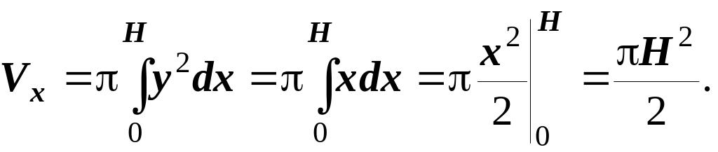 Приклад. Знайти об’єм тіла, яке описується обертаням навколо осі криволінійної трапеції, обмеженої лініями y2=x, x=H (рис.6.18).