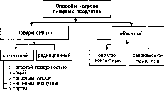 Поверхностный нагрев. В этом случае поверхность продукта нагревается при контакте с водой, паром, нагретым жиром, воздухом или инфракрасными лучами. От нагретой поверхности тепло передается за счет теплопроводности в глубь продукта, и вся его масса постепенно прогревается. Этот вид нагрева может быть контактным или радиационным.