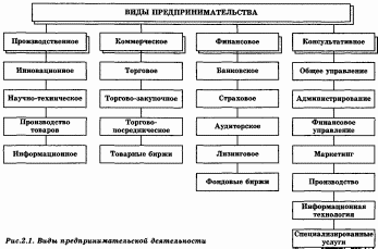 Общие виды предпринимательства включают группы отраслей и видов хозяйственной деятельности и связаны с основными фазами воспроизводственного цикла — производством продукции и услуг, обменом и распределением товаров, их потреблением: производственное, коммерческое и финансовое предпринимательство. Кроме того, в последние десятилетия в экономически развитых странах выделился в качестве самостоятельного такой вид предпринимательства, как консультирование (консалтинг). Будучи относительно самостоятельными, виды предпринимательства взаимно переплетаются, дополняют друг друга, разделяются на подвиды (рис. 2.1).