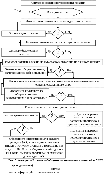 При использовании МКС для построения содержания определения рассматривается реальный процесс, который должен определяться понятием и после выделения сущностного содержания (4 "чистых" аспекта) они объединяются в текст, раскрывающий структурируемое понятие. Если же имеется несколько исходных толкований и задачей анализа является определение обобщенного содержания, то каждое толкование понятия расписывается в МКС по следующему алгоритму (см. рис. 4.). А синтез обобщающего толкования по алгоритму 2 (см. рис. 5.)
