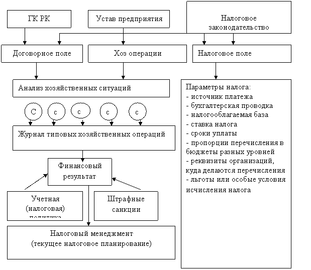 Далее подбираются типичные хозяйственные операции, которые предстоит выполнять предприятию; разрабатываются различные ситуации с учетом налоговых, договорных и хозяйственных наработок; выбираются наилучшие варианты, которые оформляются в виде блоков бухгалтерских и/или налоговых проводок; из оптимальных блоков составляется журнал типовых хозяйственных операций, который служит основой ведения финансового и налогового учета; оценивается получение максимального финансового результата с учетом налоговых рисков (возможных штрафных санкций), осуществляется наиболее рациональное с налоговой точки зрения размещение активов и прибыли предприятия; определяются альтернативные способы учетной политики организации.