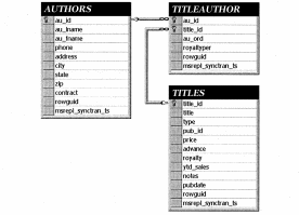 Таблица TITLEAUTHOR содержит два столбца, используемых в качестве внешних ключей. Имена этих столбцов au_id и title_id (напротив них в структуре таблицы стоит значок ключа). В таблицах TITLES и AUTHORS выбрано по одному столбцу в качестве первичного ключа. Имена этих столбцов, соответственно, title_id и au_id. Установлена связь столбца title_id таблицы TITLEAUTHOR (внешний ключ таблицы TITLEAUTHOR) со столбцом title_id таблицы TITLES (первичный ключ таблицы TITLES) и связь столбца au_id таблицы TITLEAUTHOR (внешний ключ таблицы TITLEAUTHOR) со столбцом au_id таблицы AUTHORS (первичный ключ таблицы AUTHORS). В данном случае таблицы AUTHORS и TITLES являются главными таблицами по отношению к подчинённой таблице TITLEAUTHOR. В главных таблицах имеются первичные ключи, на которые ссылаются внешние ключи подчинённой таблицы. Зачастую (как в рассматриваемом примере) главные таблицы выступают в каче-стве справочников, которые используются для получения информации, на которую ссылаются данные в подчинённой таблице.