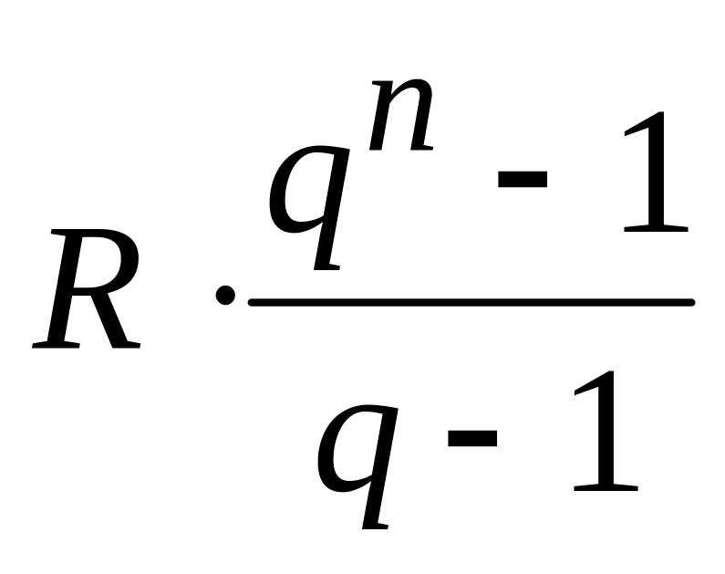 Справа стоит сумма n - членов геометрической прогрессии с первым членом R и знаменателем 1+ p = q. По формуле суммы геометрической прогрессии получаем: