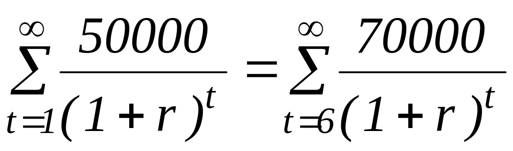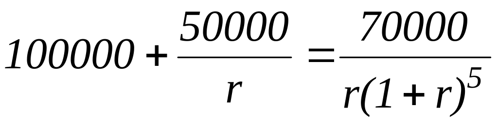 Выражение слева – современная стоимость расходов. Выражение справа – современная стоимость доходов, а уравнение называется – уравнением доходности проекта на момент времени t = 0. Используя формулу суммы геометрической прогрессии из уравнения (5) получаем