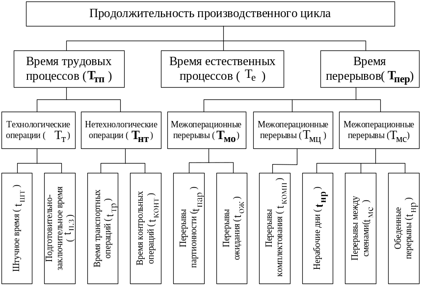 Продолжительность производственного цикла зависит от времени трудовых и естественных процессов, а также от времени перерывов в производственном процессе (рис. 5.1). В течение трудовых процессов выполняются технологические и нетехнологические операции.