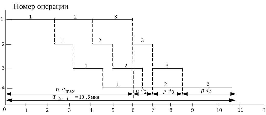 Подставив данные из приведенного выше примера (n = 3, m =4, р = 1 ) в полученную формулу, определим продолжительность технологического процесса: