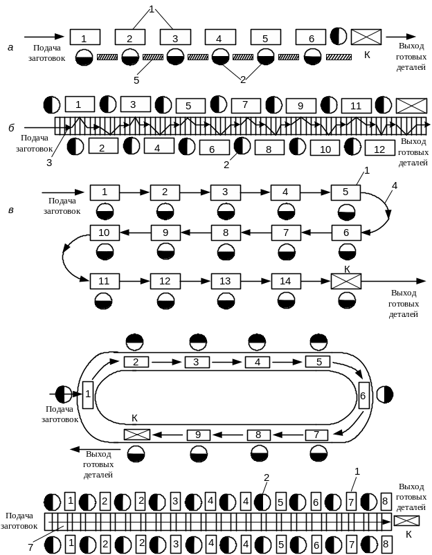 После выбора технологического оборудования и вида транспортных средств производится компоновка поточной линии. При этом желательно добиваться прямолинейного расположения оборудования (рис.8.3, а, б), если позволяют производственные площади и тип выбранных (разработанных) транспортных средств. При отсутствии достаточных площадей нередко целесообразны компоновки с Г- и П-образными, зигзагообразными (рис. 8.3, в) или кольцеобразными (рис. 8.3, г) внешними контурами. Расположение оборудования у транспортного средства в два ряда или в шахматном порядке (рис. 8.3, б, д) позволяет более рационально использовать производственную площадь цеха и экономить средства в за счет применения транспортных средств (конвейеров) меньшей длины.