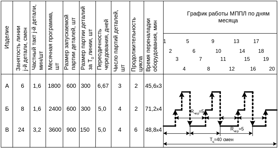 После определения календарно-плановых нормативов первой и второй групп составляются стандарт-план МППЛ с последовательно-партионным чередованием изделий -го наименования и стандарт-планы по изготовлению каждого изделия, когда МППЛ работает как ОППЛ, а также строятся эпюры движения оборотных заделов по каждому изделию, рассчитываются средняя величина оборотных заделов, незавершенное производство и продолжительность производственного цикла обработки партии деталей за период оборота линии.