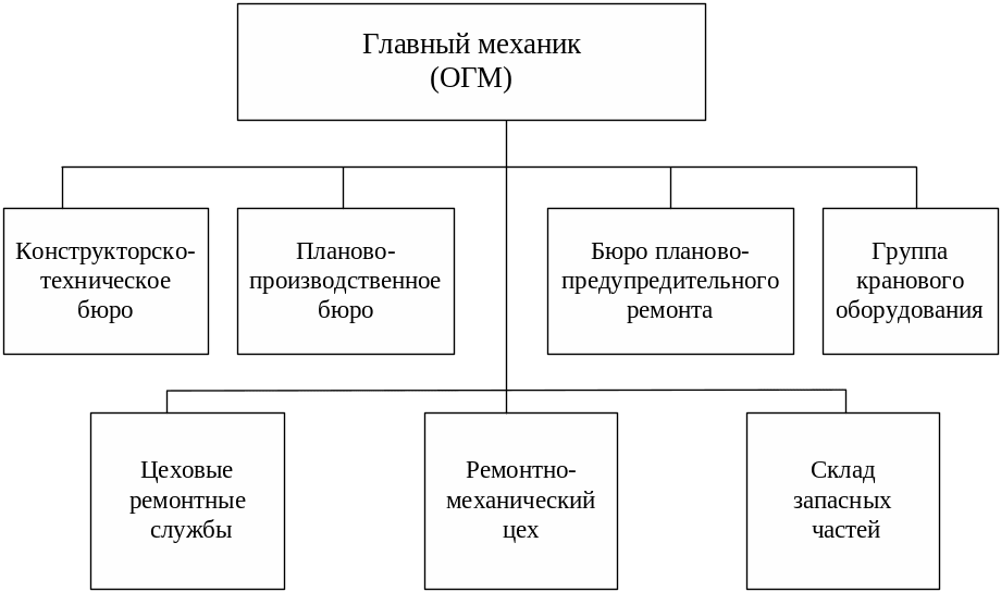 В составе ОГМ, как правило, создаются следующие функциональные подразделения: бюро планово-предупредительного ремонта (ППР), конструкторско-технологическое бюро, планово-производственное бюро и группа кранового оборудования.