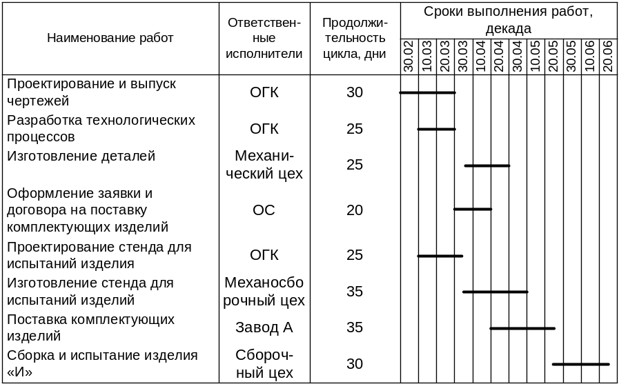Ленточные графики составляют от конечного, заданного срока освоения производства нового изделия. Горизонтальные отрезки, которые наносятся параллельно, отражают продолжительность циклов каждой стадии, этапа или отдельной работы, рассчитанных по нормативам или экспертным путем по формуле (21.1).