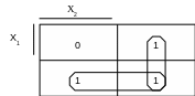 Щоб знайти просту імпліканту, яка описує контур, необхідно з'ясувати, від яких змінних не залежить даний контур. Оскільки вертикальний контур в табл. 2.1 охоплює рядки з х1 та х1 , то х1 в імпліканту, яка описує даний контур, не входить (по ній два сусідні набори склеюються). Міркуючи аналогічно, з'ясовуємо, що в просту імпліканту, яка описує горизонтальний контур, змінна х2 входити не буде. Отже, мінімальна ДНФ логічної функції, що задана таблицею істинності на рис.2.5, має вигляд: