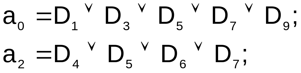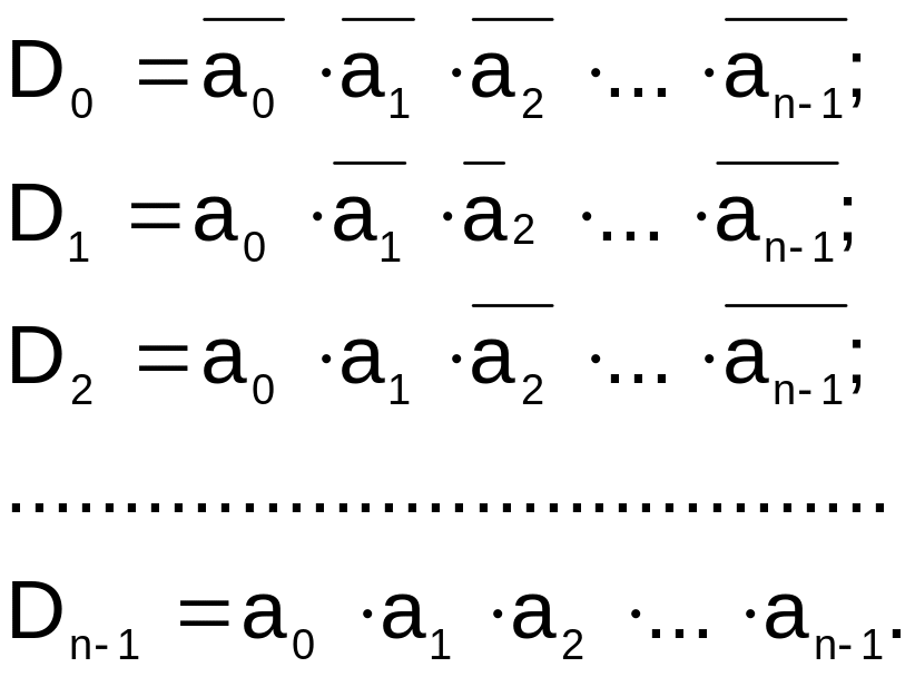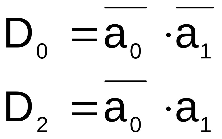 У загальному випадку вихідні функції Di(a0,a1, …) дешифратора на n входів описує система логічних виразів, зображених на ДДНФ конституентами одиниці: