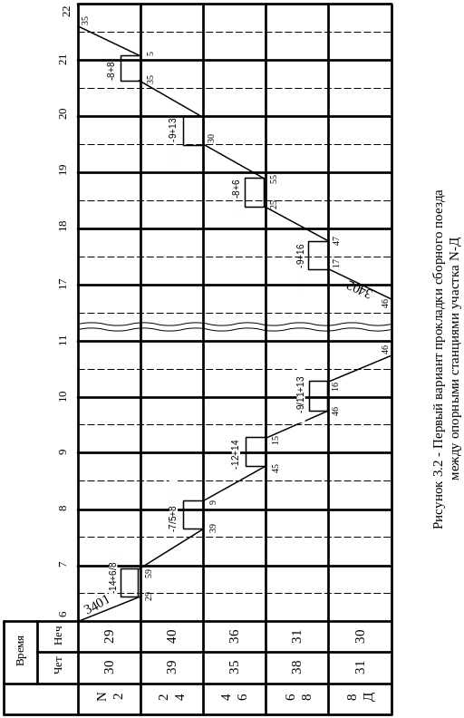 На втором участке А-N не составляем график движения поездов, время отправления сборных поездов с участковых станций и продолжительность работы на опорных станциях принимаются такими же, как в лучшем варианте.
