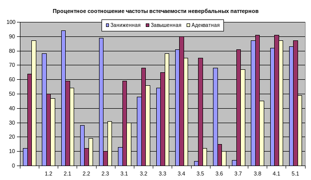 Бросается в глаза бедность паттернов невербального поведения присущих испытуемым с адекватной самооценкой. По нашему мнению это можно проинтерпретировать как преобладание контекстно обусловленных жестов и ориентации на когнитивное решение задачи.