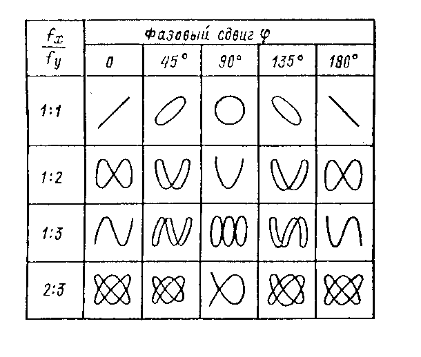 Үлгілі генератордан алынған сигналдың жиілігін жаймен өзгерту арқылы экранда қарапайым Лиссажу фигурасын аламыз. Өлшеу кезінде қарапайым фигура – эллипс алуға тырысады, яғни fx = fo. Эллипстің көлбеулігі ауытқытушы кернеулер арасындаңғы фазалық ығысуды көрсетеді (6.1 кесте). Салыстырылатын сигналдардың жиіліктерінің қатынасын фигураның ойша жүргізілген вертикал және горизонтал сызықтарды кесіп өткен нүктелер санымен анықтайды.