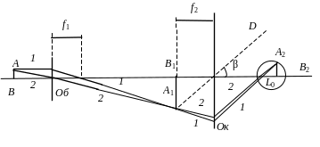 де Δ – оптична довжина тубуса; S – відстань найкращого зору; f1 – фокусна відстань об'єктива; f2 – фокусна відстань окуляра.