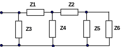 Электрическая цепь представляет собой параллельное соединение двух ветвей. В первую ветвь входит элемент с комплексным сопротивлением Z3. Вторая ветвь образована последовательным соединением элемента Z1. и параллельно включенных элемента Z4 и ветви, которая образованна последовательным соединением элемента Z2. и участка цепи с параллельным соединением элементов Z5, Z6.