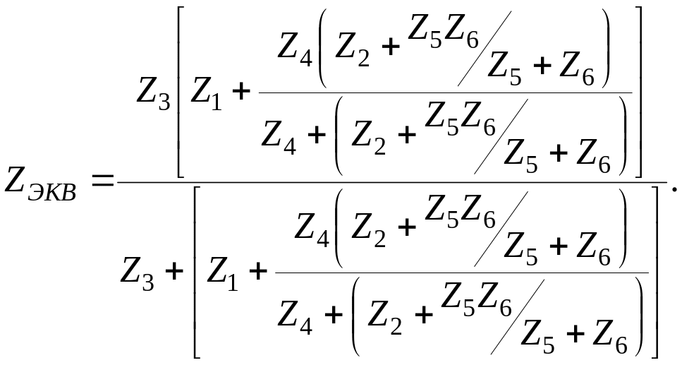 На этой схеме имеется группа элементов Z5, Z6, соединенных параллельно. Эта группа с элементом Z2 соединена последовательно. Отмеченное последовательно-параллельное соединение, в свою очередь, является участком цепи, включенным параллельно элементу Z4. Эта группа элементов включена последовательно с элементом Z1. Наконец, отмеченная выше цепь включена последовательно с элементом Z2.