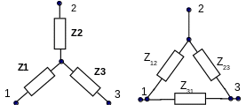 Правило преобразования «звезды» в «треугольник»: комплексное сопротивление ветви треугольника равно сумме попарных произведений комплексных сопротивлений лучей звезды, деленной на комплексное сопротивление луча, не подсоединенного к одноименным узлам.