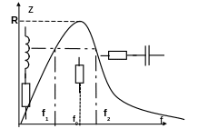Если параллельный контур подключить к реальному источнику гармонического тока, то можно утверждать, что параллельный контур «выделяет» напряжение резонансной частоты, а также сигналы, частоты которых находятся в полосе (диапазоне) частот примыкающей к резонансной частоте. Этот диапазон частот называют полосой пропускания контура. Границы полосы пропускания определяют частоты f1 и f2. Полоса пропускания контура определяется формулой