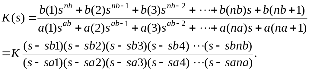В соответствии с основной теоремой алгебры любой полином может быть разложен на множители, соответствующие его корням. Поэтому операторная передаточная функция всегда, в общем виде, может быть записана как