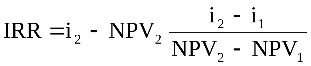 NPV1 і NPV2 – значення NPV при ставках дисконтування і1 і і2 відповідно, і1 і і2 необхідно підібрати такими, щоб NPV1 і NPV2 мали різні знаки.