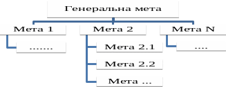 Процедура декомпозиції цілей припускає використання спеціальних методів. Одним з найбільш поширених з них є метод "дерева цілей". Сутність методу "дерева цілей" полягає в наступному. Спочатку генеральна ціль розбивається на цілі нижчого рівня, що визначають основні напрями її досягнення. Таким чином формується перший рівень "дерева цілей". Потім кожна мета першого рівня підрозділяється на більш конкретні цілі, тобто формується другий рівень. Аналогічним чином поступають і з декомпозицією цілей кожного подальшого рівня. Загальний вигляд "дерева цілей" представлений на рис. 6.2.