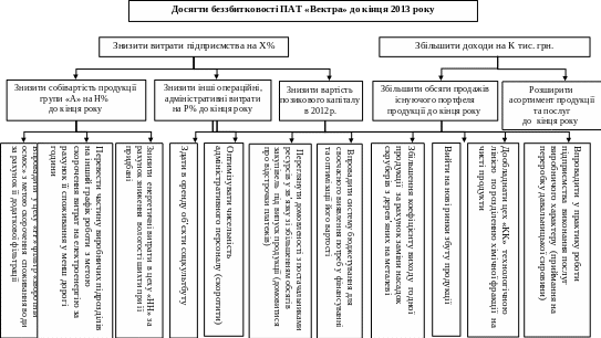 Розроблена система цілей підприємства («дерево цілей») для визначення шляхів досягнення беззбитковості діяльності підприємства «Вектра» наведена на рис. 6.3. При розробці цілей враховувався той факт, що підприємство не може впливати на фактор ціни, оскільки рівень цін досить жорстко регулюється ринком. Всі зусилля були направлені на скорочення питомих змінних витрат, загальної суми постійних витрат та скорочення питомих постійних витрат за рахунок збільшення обсягів виробництва.