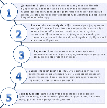 Теоретичне узагальнення практичного досвіду по встановленню цілей дозволяє виділити декілька ключових вимог, яким повинні задовольняти правильно сформульовані цілі (рис. 6.1).