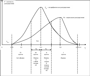 Принимая логарифмическое или нормальное распределение рыночных долей конкурентов, определим конкурентную позицию фирмы. При этом среднеарифметическая рыночная доля является разделяющей линией между слабыми и сильными позициями. Построим график плотности распределения рыночных долей конкурентов для своего предприятия ООО «Примерное».