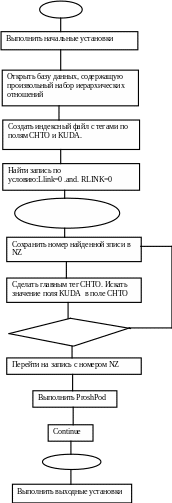 В результате мы получим представление сетевой структуры в виде избыточного двухсвязного списка. В соответствии с алгоритмом, приведенном на Рис. 13, а также нижеприведенными комментариями к нему, легко написать программу прямого обхода на любом из диалектов хBASE или Delphi и убедиться в её работоспособности на созданной таблице.