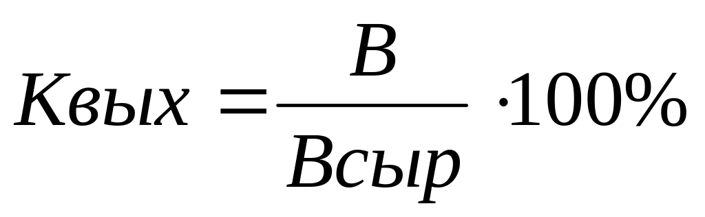Коэффициент выхода продукции (полуфабриката) из исходного сырья – используется отраслях легкой, пищевой промышленности, в деревообработке, в промышленности строительных материалов, в черной и цветной металлургии, в отраслях первичной обработки сырья используется, рассчитывается по сл. формуле: