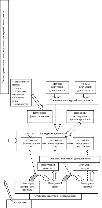 Таким образом, механизм венчурной деятельности включает в себя: совокупность отношений инвесторов и венчурного фонда по поводу формирования фонда венчурного капитала, отношения венчурного фонда и венчурных фирм (предпринимателей) по поводу поиска, оценки, отбора и инвестирования венчурных проектов, отношения между венчурными фондами и фирмами, складывающиеся непосредственно при реализации венчурных проектов.