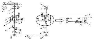 1 – электродвигатель; 2 – передача ременная клиновым ремнем (примечание: электродвигатель 1 и ременная передача 2 могут быть заменены на компактный мотор-редуктор); 3 – упорный подшипник; 4 – радиальный подшипник (примечание: вместо двух подшипников в верхней подвеске винта может устанавливаться один – радиально-упорный, внизу устанавливается только радиальный подшипник); 5 – несущий грузовой винт (материал – сталь); 6 – каретка с направляющими роликами; 7 – грузовая гайка (материал – бронза);8 – подхваты; 9 – страховочная гайка (материал – сталь); 10 –передача цепная (в других моделях подъемников может быть карданная или зубчатая коническая); 11, 12, 13, 14 – конечные выключатели; 15 – стойка; 16 – страховочная гайка; 17 – консоль телескопическая, 4, 18 – фиксирующий болт с рукояткой; 19 – упор.