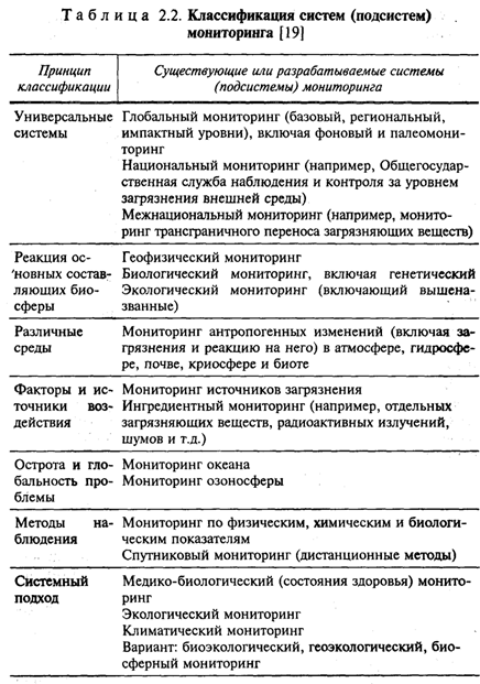 В зависимости от конкретных целей, задач, объектов наблюдения различают несколько видов и классо в мониторинга. По объектам наблюдения различают: атмосферный, воздушный, водный, почвенный, климатический мониторинг, мониторинг растительности, животного мира, здоровья населения и т.д. Существует классификация систем мониторинга по факторам, источникам и масштабам воздействия.