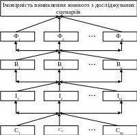 Метод ґрунтується на застосуванні так званих ієрархічних мереж у разі побудови моделі, призначеної для розрахунку ймовірностей виникнення кожного можливого сценарію в майбутньому. Причому на першому етапі група фахівців, що керує виконанням досліджень, повинна хоча б вербально (у словесній формі) визначити, чим є реально можливі сценарії майбутнього. Ймовірність виникнення або ступінь невизначеності кожного можливого сценарію визначають застосуванням алгоритмів цього методу і моделі ієрархічних мереж. Модель використовуваної для цього типу задач ієрархічної мережі показано на рис. 7.3.
