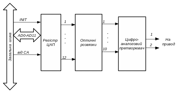 Після чого поступає на оптрони, які забезпечують гальванічну розв’язку між низьковольтними ланцюгами живлення МП - системи та живленням ЦАП, де присутня напруга +10В та ±15В. Після оптронів 10 розрядів поступає на ЦАП(AD0 - AD09). Розряди АD10 та АD11 поступають на вхід аналогового ключа, щоб забезпечити вибір відповідного каналу приводу.