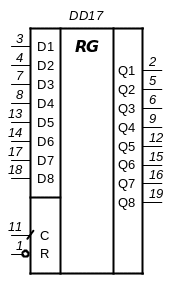 Мікросхема К555ТМ8 складається з 4-х D - тригерів. Умовно-графічне позначення приведене на рис.2.16, живлення підводиться до 8 і 16 виводам. Режими роботи ІМС К555ТМ8 приведені в таблиці 2.5.