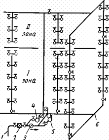 Рис. 5. Схема зонального водоснабжения: 1 — ввод, 2 — водомер, 3 — обратный клапан, 4 — хозяйственный насос, 5 — пожарный насос, 6 — нижняя магистраль