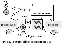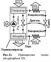 Основна відмінність абсорбційної ТП від компресорної полягає у тому, що тут відсутній компресор – споживач високоякісної енергії. Замість нього використовується термокомпресор, який складається з рідинної помпи, дроселя і двох тепломасообмінних апаратів - абсорбера і генератора, див. рис. 11. В абсорбційній ТП використовується двокомпонентне робоче тіло: "холодоагент + абсорбент". Абсорбентом може бути будь - яка рідина, що ефективно поглинає холодоагент, наприклад, для аміаку (NH3) вода.