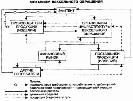 Одним из важнейших условий внедрения вексельной схемы расчетов является создание специализированной инфраструктуры обращения для непосредственного осуществления и контроля за эмиссией, их авалирования и погашения, ведения реестра ремитентов, оказания юридических услуг участникам обращения, формирования специализированных фондов на основе векселей, организации и проведения вексельных расчетов и др. В рамках механизма обращения функционируют, как правило, специализированные организации: эмиссионный центр, уполномоченный банк, финансовая или инвестиционная компания и снабженческо-сбытовые фирмы, осуществляющие операции с векселями (схема 121).