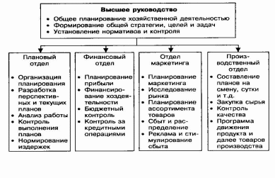 Аппарат, осуществляющий внутрифирменное планирование, включает функциональные подразделения на разных уровнях управления предприятием. Поскольку планирование — это основная функция управления, то высшим звеном системы планирования можно считать Совет директоров, принимающий решения по наиболее важным проблемам стратегии и тактики предприятия.