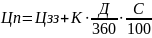 У першій і другій пропозиціях термін оплати постачання становить ( ) днів, але в другій пропозиції для передоплати необхідно брати кредит у розмірі закупівельної ціни на ці ( ) днів і платити відсотки, тобто ціна пропозиції буде рівна сумі закупівельної ціни і величині відсотка на неї. Величина відсотка розраховується за формулою (1)