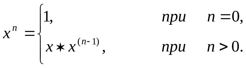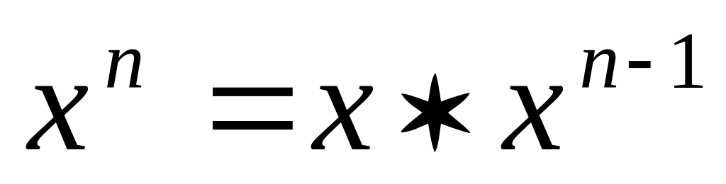 Попробуем представить степенную функцию с помощью рекурсивного процесса. Будем опираться на то, что начальная степень двойки 20 = 1, а последующие ее степени есть всего лишь удвоение предыдущего значения. Процесс использования меньшей степени для вычисления очередной приводит к рекурсивному определению степенной функции. Для действительного x значение xn определяется как
