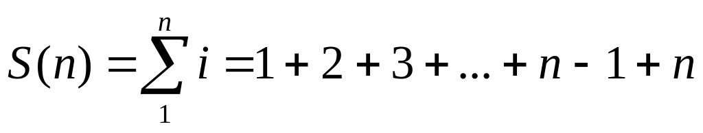 Похожее рекурсивное определение описывает функцию S(n), дающую сумму первых n целых чисел. Для простого случая S(1) сумма равна 1. Сумма S(n) может быть получена из S(n-1):