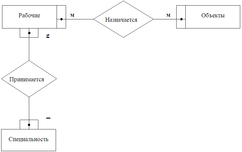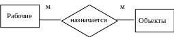Между сущностями рабочие и объекты возникает отношение «назначается» (рисунок 1.2) и степень связи много со многими (М:М), т.к. один рабочий может быть назначен на множество объектов, и на один объект назначается много рабочих.