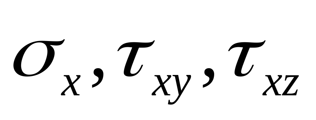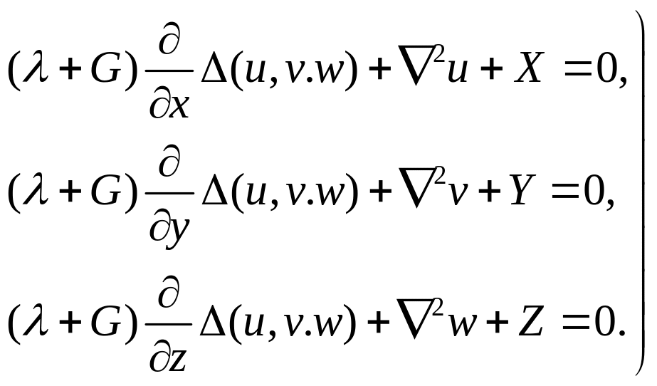 Уравнения равновесия в напряжениях. Для постановки конкретной задачи теории упругости по определению характеристик напряженно-деформированного состояния тепа под действием заданной нагрузки выше получены все необходимые соотношения. Действительно, неизвестные величины шести напряжений σx, σy, σz, τxy, τyz, τxz, деформаций и перемещений u, v, w принципиально могут быть определены совместным решением системы уравнений равновесия в напряжениях (1.6), соотношений закона Гука (1.15) и геометрических условий связи между деформациями и перемещениями (1.11). Вместе с тем, эти соотношения позволяют выразить все неизвестные величины через три перемещения u, v, w, сведя тем самым систему пятнадцати уравнений с пятнадцатью неизвестными к трем уравнениям равновесия в перемещениях. Опуская промежуточные выкладки, запишем эту систему в виде –